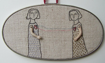 All the pieces in this series are embroidered on antique homespun linen and framed in vintage metal embroidery hoops. The little antique arms were excavated from the grounds of an old doll factory in Thuringia, Germany.