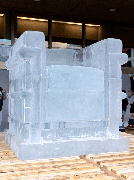 An exhibit featuring five iconic designs sculpted in ice blocks. This one, the LC2 Chair by Le Corbusier.